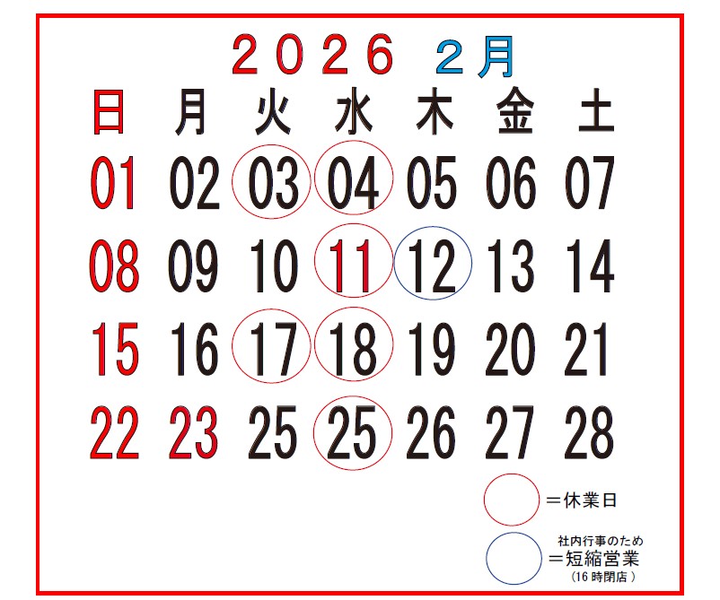 2026年2月の営業日時のお知らせ